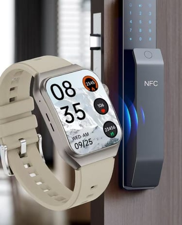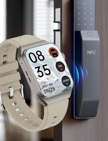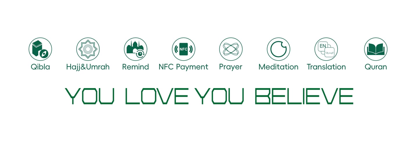 Features table (prayer reminders, certification, NFC payment, health monitoring)